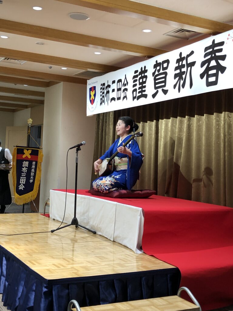 あちこちで談笑の花が咲き、会場全体が賑やかになるなか、音曲師・桂子すみさんによるアトラクションが始まりました。桂さんは東京学芸大学卒業後にウィーン国立音楽大学に国費留学しミュージカルを専攻。帰国後に三味線弾きを志し、国立劇場第11期寄席囃子研修を経て落語芸術協会にてお囃子として活動後に音曲師に転向したという、邦楽・洋楽のジャンルを飛び越えた多彩な経歴をお持ちの方。音曲師とは寄席で落語の合間に三味線など邦楽器に合わせて小唄などを聞かせる江戸時代に生まれた舞台芸人を指しますが、桂さんは唄・三味線のほか尺八も吹き、古典のみならずオリジナルの新作も手がけ、三味線またピアノ弾き語りのシンガーソングライターとしても活動されています。2022年(令和3)には若手演芸家の登竜門、国立演芸場の花形演芸大賞を音曲師で初めて受賞しました。