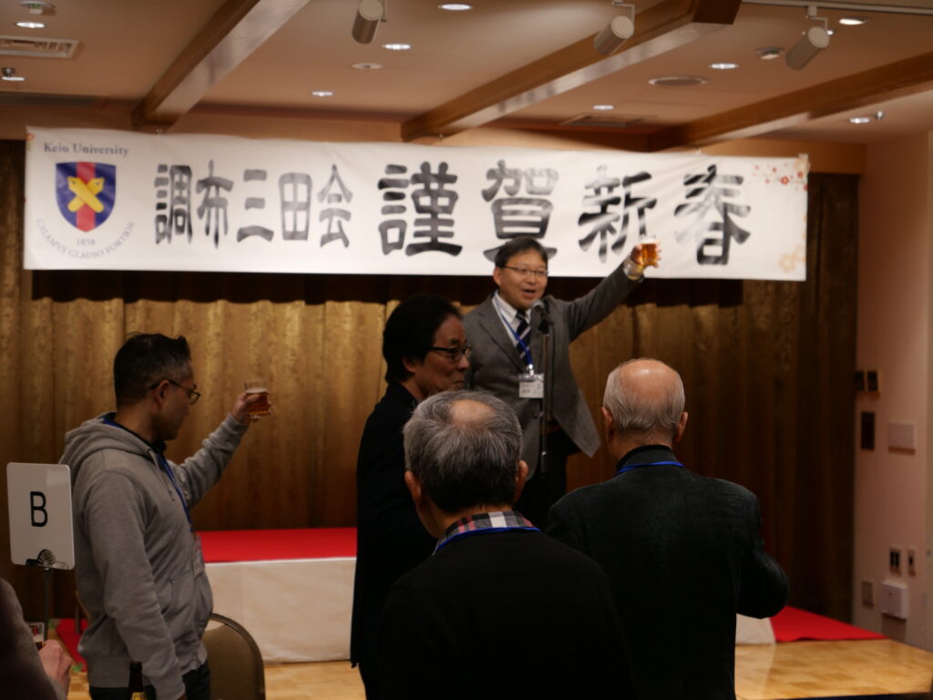 2 月 1 日(日)、恒例の新年会がホテルコンチネンタル府中で開催され、93名が参加しました。司会・進行は秋山実君(1986 理工)。冒頭、堀尾会長が「この1年も8名の新入会員を迎え、当三田会は会員数約240人と近隣の三田会の中でも有数の規模となっている。本日発行の『調布三田会報』55号は創立40周年記念号で読み応え十分。私の任期は(5月の総会まで)あと数カ月だが、50、60周年に向けて会員の皆さんのさらなるご指導と支援をお願いしたい」と挨拶。続いて飯島正行君(1991 理工)が「(競馬場のある)府中という午年にふさわしい場所での開催で思うのは丙午のこと。私は丙午翌年の生まれだが人数の少ない丙午学年の煽りを受け高校+駿台で4年過ごす羽目になった。でもそのお陰で世界一の名門慶応に入ってこうして皆さんとお会いすることができる幸せをかみしめている」と笑いを交えた挨拶から乾杯の発声を行い、会場は一気に和やかな雰囲気に。それから柳本正博君(1971 政)ほか8人の新入会員の自己紹介と続き、懇親に移りました。