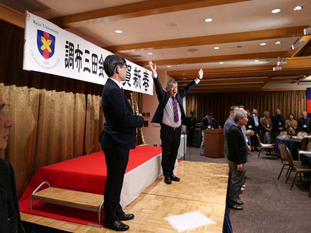 宴半ばに調布市長の長友貴樹君(1976 政)からの挨拶があり、終盤にはこれも恒例となっている腰原武人君 (1990 政)のトランペット演奏と川原哲郎君(1992 経)の見事なリードにより、全員で肩を組んで「若き血」を大合唱。最後に今年卒業 50 年となる古川善朗君(1975 法)が中締めの挨拶として「塾長も務められた清家篤さんの、健康寿命と合わせ職業、資産の三つの寿命を延ばすことが生涯現役のために不可欠という言葉が常に心にある。今私は74歳だが、三田会テニス同好会で指導を受けている大先輩の益子淳(1968 政)さんにはいつも圧倒されていて、益子さんに接する度に清家さんの言葉を思い出す」と締めくくり、楽しく和やかな雰囲気のなか、お開きとなりました。 平井信太郎(1989 文)